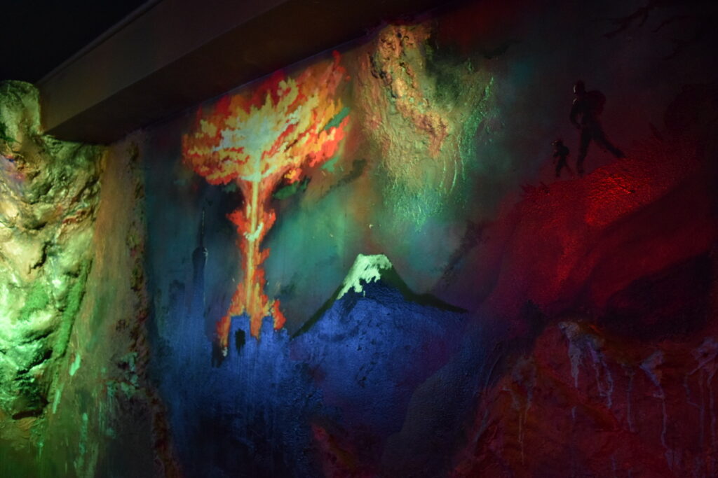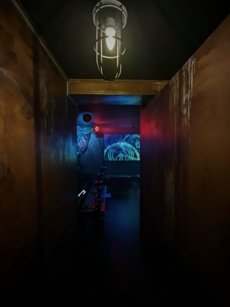 壁面には打ちっぱなしのコンクリート、錆びた鉄材、ノイズ感のある演出照明が施され、どの時間帯に訪れても独特な静寂と没入感を得られます。