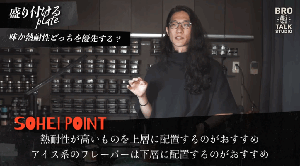 一方、スーパーノバなどのアイス系のフレーバーや、香りが飛びやすいフレーバーを上に配置すると、すぐに清涼感がなくなってしまうため、アイス系は一番下に配置することが多い。
